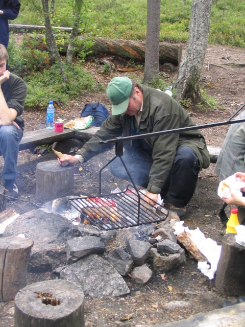 Po minięciu diabelskiego drzewka docieramy do miejsca biwakowego. Jest to kolejna różnica w stosunku do Polski, zamiast zabraniać biwakowania w parku, zostało specjalnie przygotowane do tego celu miejsce, wyposażone w piec z naczyniami, skład drewna, kominek i krąg ogniskowy z grillem. Rozmowy, pieczenie kiełbaski, upajanie się pięknem przyrody... tak minęły nam około 2 godziny. Przewodnik nie ruszył się z miejsca dopóki wszystko nie zostało posprzątane - co można było spalić, to do ogniska, a pozostałe rzeczy zabieramy ze sobą. Przywiązanie Finów do czystości środowiska potwierdziła odpowiedz na pytanie czy można spalić plastikowa butelkę, która nie była na kaucje - dlaczego, przecież można ja użyć jeszcze wielokrotnie... U nas było by to zbieractwo, tutaj przejaw dbania o środowisko naturalne.