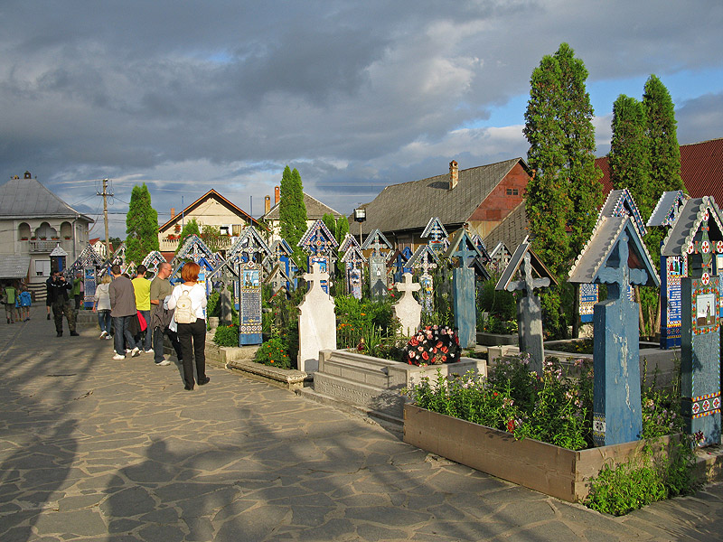 Cimitirul Vesel zlokalizowany jest w miejscowości Sapanta, około 300-400m od głównej drogi 19 (nie jest z niej widoczny). Pierwszy kolorowy nagrobek powstał w 1935 roku, wykonany przez miejscowego rzeźbiarza Ioan Stan Patraş. Na każdym z nich znajduje się ilustracja mówiąca o życiu danego człowieka lub przyczynie jego śmierci.