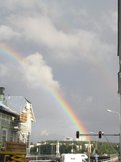 Dzień bez zajęć, rano trochę nauki, porządki w pokoju potem biegiem na uczelnie posurfować trochę po sieci. Wracając do akademika mam okazje zobaczyć wspaniałą tęcze, a właściwie nie jedna tęcze a kilka jedna nad druga. Niestety na zdjęciach widać tylko podwójna. Wieczorem razem ze znajomymi z uczelni wybraliśmy się zobaczyć Jyväskyle nocą i na "happy hour" do "Sohwi". Przed akademikiem spotykamy doktorantkę z Rumuni, studiująca na Krecie i takim powiększonym gronem uderzamy na miasto. Najpierw nasz pub i ulubiony napój czyli Upcider (coś jak oranżada tylko odrobinę wzmocniona). Następnie długi spacer najstarsza częścią Jyväskylä wśród mnóstwa klubów i ogródków piwnych. Wracając mijamy sklep sportowy z gigantycznym plecakiem. Nic czas iść spać jutro intensywny dzień.