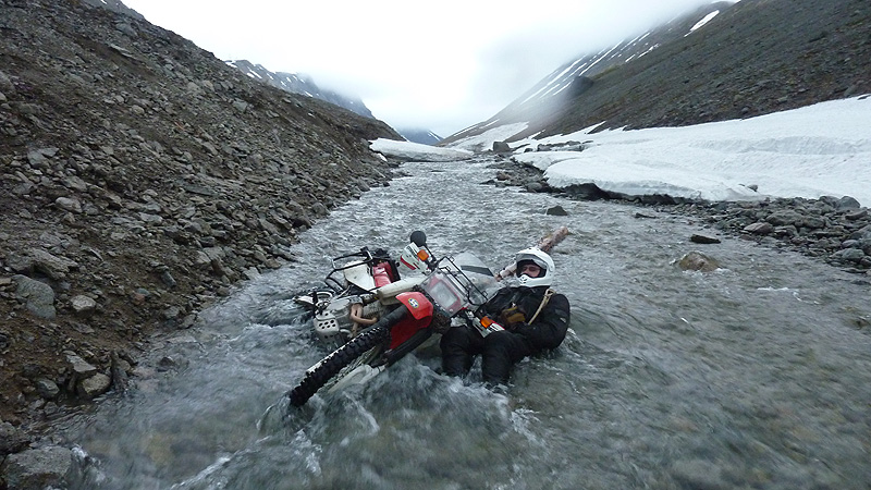 Szybka kolacja i jedziemy na pusto zabierając tylko batony i wodę. Z relacji znajomych wiemy, że droga wiedzie wprawdzie momentami rzeką, ale płytką. Później pięknie i szybko. Dojeżdżamy zgodnie z planem do kopalni, przed nią w lewo. Jest i płytka rzeka. Przebijamy się i wyjeżdżamy na brzeg. Trochę błota i śniegu, ale da się w miarę sprawnie jechać, objeżdżając łąką trudniejsze momenty. Po pewnym czasie droga wjeżdża znowu do rzeki. Hmmmm... tego tu miało nie być. Spojrzenie na GPS - wszystko sie zgadza. Próbujemy. Z każdym metrem prąd robi się coraz silniejszy, czasami wręcz cofa motocykl. Jedyna szansa to trzymać się stromego brzegu i odkręcać gaz, co czasem kończy się zakopaniem motocykla. Powoli, bo powoli, ale udaje się pokonać tę przeszkodę. Za to czekają nas nowe atrakcje w postaci łach śniegu, który jest dość miękki, przez co motocykle trzeba przepychać. W pewnym momencie mijają nas Rosjanie na quadach - twierdzą że da się dojechać do schroniska ale „śniegu mnogo”. Po kilku godzinach walki, gdy więcej jest śniegu niż szutrowej drogi, decydujemy się na powrót. W wyższe partie gór nie damy rady się wbić, więc może jutro na świeżo spróbujemy. W drodze powrotnej zmęczenie daje o sobie znać i zaczynamy popełniać błędy. W najbardziej rwącym odcinku rzeki zaliczamy „gleby”, które najgorzej kończą się dla Patryka - skręca nogę. Później kładę motocykl w kałuży na stronę tłumika. Próbując go podnieść wywracam się razem z nim na druga stronę. Dopiero teraz uświadamiam sobie, że dno kałuży pokryte jest lodem... Próbuję odpalić silnik - nic. Wykręcam świece, kręcę rozrusznikiem i dostaję fontannę wody w twarz. Szybka decyzja - próbujemy holowania motocykla w terenie, do czego przydaje się lina, szekle i taśmy, które wziąłem ze sobą. W ten dość karkołomny sposób wracamy do miasteczka. Na asfalcie próbuję odpalić motocykl na holu. Zapala, ale kopci na biało. W dodatku, gdy po chwili sprawdzam olej, widać w nim wodę. Jest źle, ale nie tragicznie. Przyjechaliśmy 2-3 tygodnie za wcześnie. Przed rokiem, na początku lipca, nie było prawie w ogóle śniegu, a rwący potok był wilgocią miedzy kamieniami. Padamy ze zmęczenia.